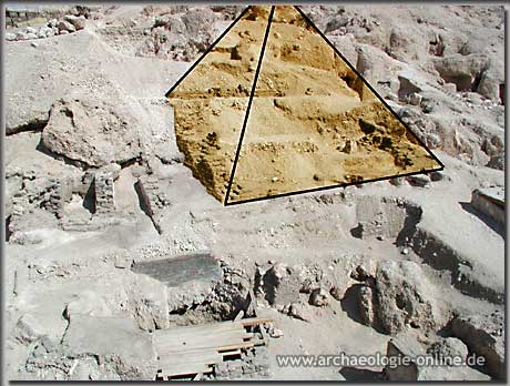 D. Polz entdeckte im verfüllten Grabschacht über 250 Keramikgefäße sowie einen stark beschädigten Steinkopf des Königs.