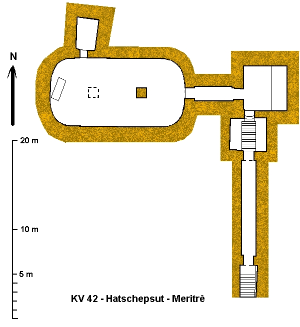 Der Grundriss zeigt deutlich die Ähnlichkeit mit den Königsgräbern dieser Epoche. Nur der in Königsgräbern vorhandene Schacht wurde nicht angelegt.