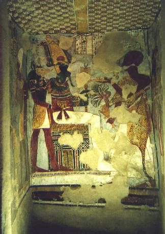 dem Anubis-Schakal, an der linken Wand bringt er dem vergöttlichten König