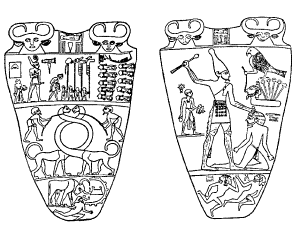 Vorderseite zwischen zwei Hathorköpfen den Horusnamen des Königs innerhalb einer "Palastfassade". Die Palette berichtet von den Feldzügen des oberägyptischen Königs gegen Unterägypten.