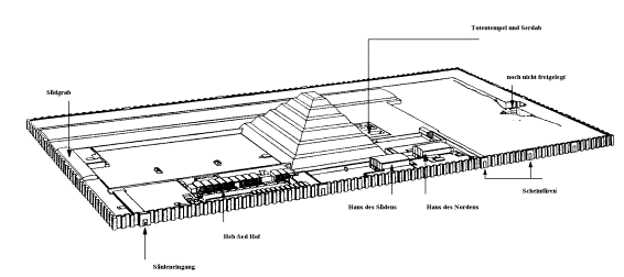und Scheinbauten. Es sind Nachahmungen der Paläste, die der Pharao zu Lebzeiten bewohnt hat sowie Zeremonienhöfe und ein Totentempel.