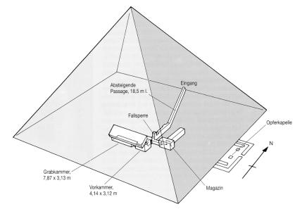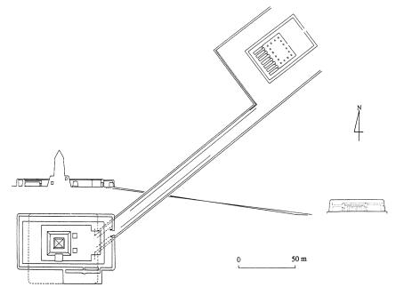 Südlich der Pyramide stand der Pyramidentempel, ob aus Platzgründen oder aus religiösen Motiven (Sonnenkult) ist strittig. Ebenfalls bis dahin unüblich war die kleine Opferkapelle an der Ostseite. Der Taltempel ist bis heute unentdeckt.