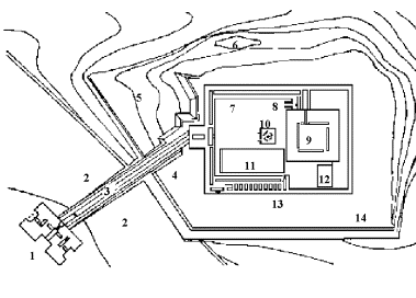 1. Torbau im Tal 2. Stadt 3. Aufweg 4. obere Terrasse 5. untere Terrasse