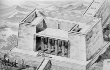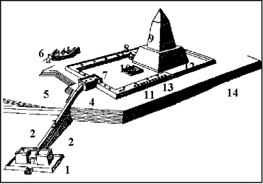 mit einem Alabasteraltar von 5,5 m x 6 m, Schlachthöfen und einem gemauerten Obelisken von 36 m Höhe auf einem 20 m hohen Podest, den man früher für eine Pyramide hielt