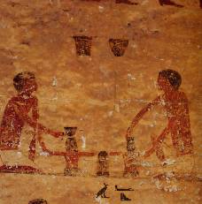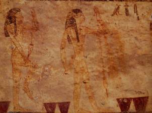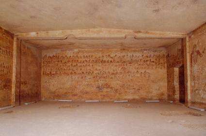 Südwand: Zwischen Ostwand und Kultnische sechs Register: Weinherstellung, Vogelfang, Katze, Maus, Affen; Kornmalen, Brot- und Kuchenherstellung, Opferträger. Es folgt die Kultnische, anschließend Darstellung des Bakt mit Falke. Sieben Register, in der Mitte unterbrochen durch Bakt: Männer mit Schrein, Kulttänzer, Diener mit Kultgegenständen, Schmuck, Kleidung, Waffen. Viehzählung an Rindern und Eseln, Bestrafungsszenen, stillende Mutter, Töpfer an Drehscheibe und Brennofen, Holz- und Metallbearbeitung, Hirten mit Tieren, Spiele (auch Brettspiel), Vogel- und Fischfang. Zum Abschluss stehende Figur des Bakt.