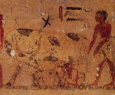 Westwand: Nordseite (links) Papyrusernte, sitzende und stehende Figur des Bakt. Südseite: oben Bakt, stehend, vor ihm Opferträger; darunter Opferung eines Rindes, Landschaft mit Bäumen und Ziegen, Boote bei der Abydosfahrt.