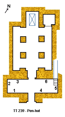 Seine Grabanlage befindet sich in Dra Abu el-Naga (TT 239). Die Säulenhalle