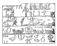 Vorderseite zwischen zwei Hathorköpfen den Horusnamen des Königs innerhalb einer "Palastfassade". Die Palette berichtet von den Feldzügen des oberägyptischen Königs gegen Unterägypten.
