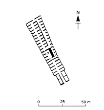 Ecke stand ein kleines, 18,3 m x 15,5 m großes Gebäude. Evtl. ist diese Anlage